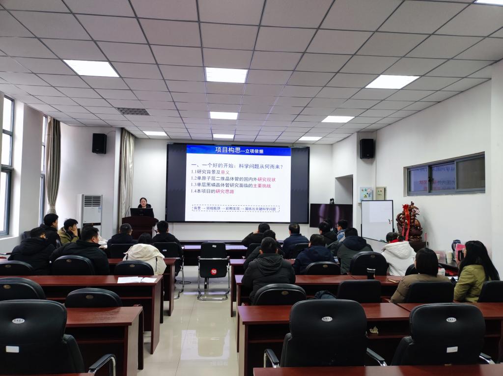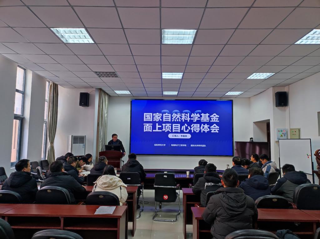 会议共分两个阶段。第一阶段,邀请信阳师范大学物理电子工程学院李盈傧、李婉莹两位教师作国家自然科学基金申请专题报告,学院40岁以下青年博士参会。李盈傧结合自身申报国家自然科学基金面上项目的实践经验,围绕函评意见解析、题目与摘要凝练、研究基础展示以及团队协作支持等关键环节,系统分享了申报心得与策略。李婉莹从项目立项依据、研究设计与路线、拟解决的科学问题、创新性、工作基础、细节与心态等方面分享了申请青年项目的经历和感悟。