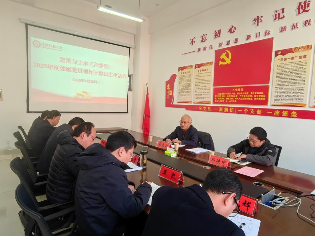 1月12日下午,建筑与土木工程学院在综合实验楼402室“党员之家”召开2025年度处级党员领导干部民主生活会。校党委副书记龚立新,纪委副书记、目标考核与督查办公室主任杨轶中到会指导。学院全体处级党员领导干部参加会议。会议由建筑与土木工程学院党委书记王永贵主持。