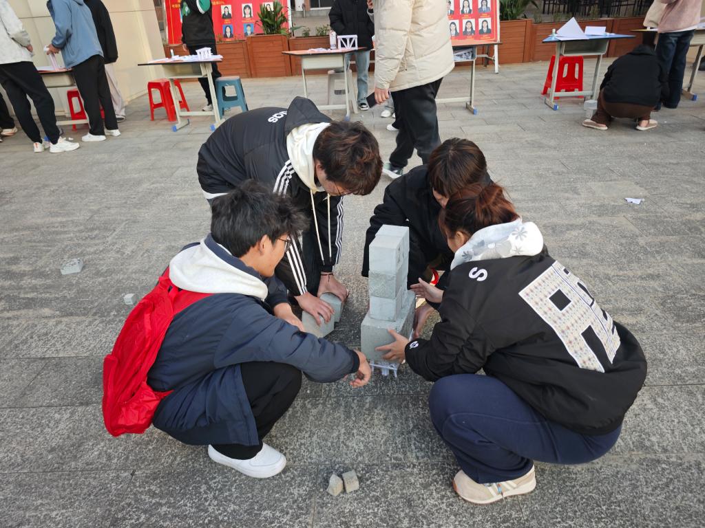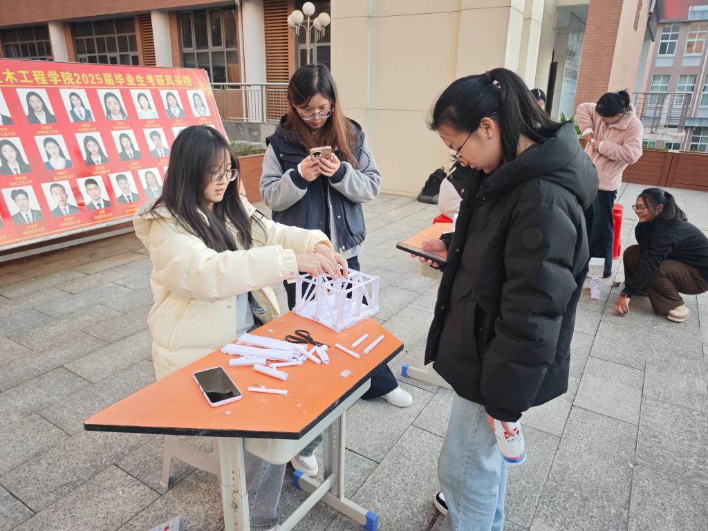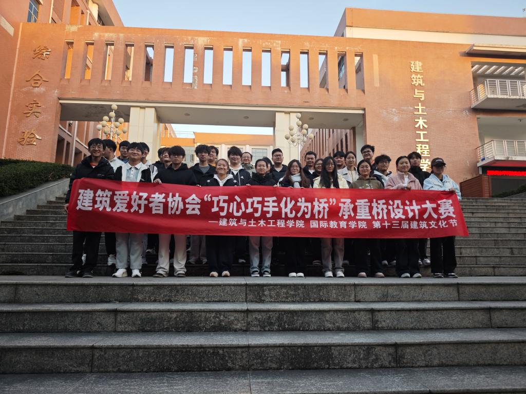 11月25日下午,建筑与土木工程学院建筑爱好者协会在综合实验楼小广场举办“巧心巧手化为桥”承重桥梁设计大赛,社团指导老师钱文蹈、社团部分学生以及参赛选手参加活动。