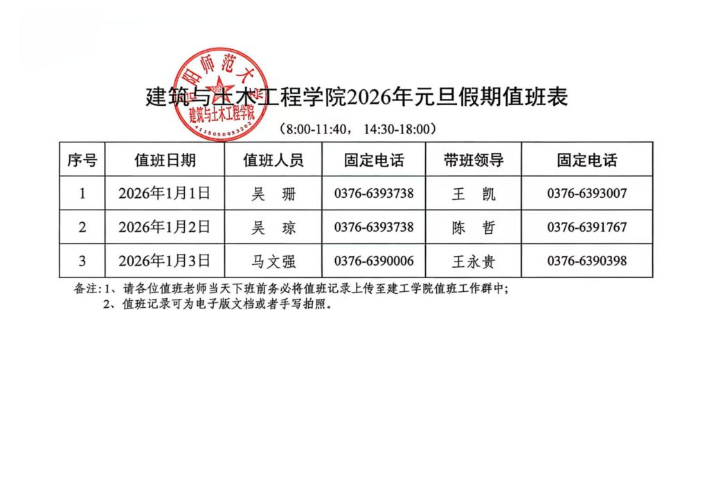 建筑与土木工程学院2026年元旦假期值班表