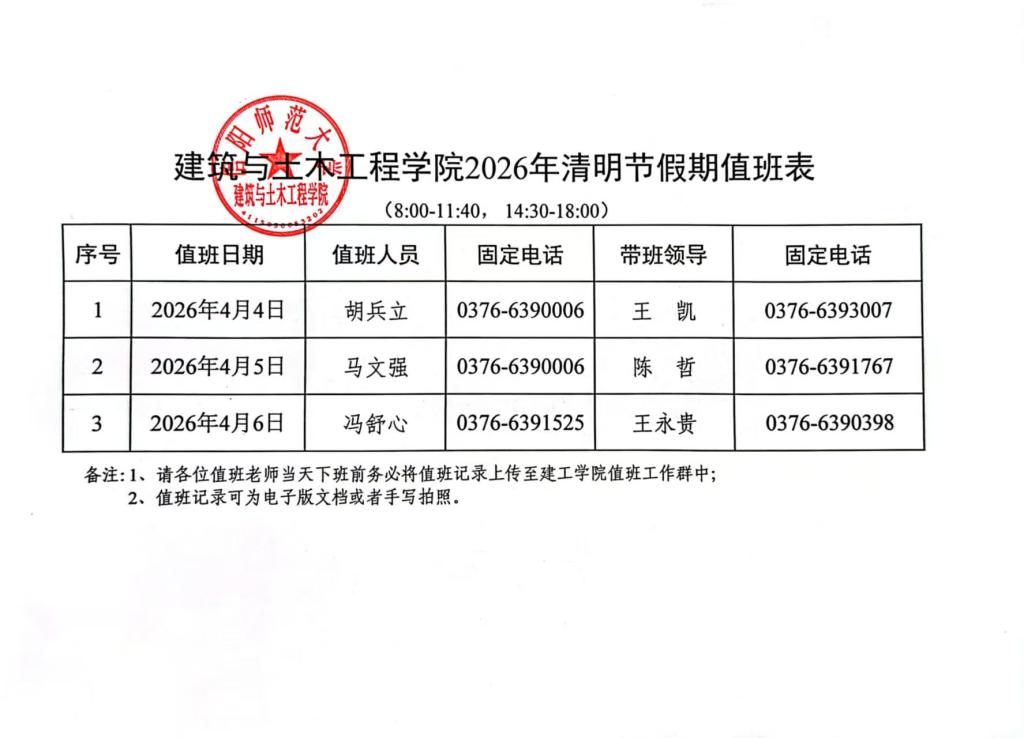 建筑与土木工程学院2026年清明节假期值班表